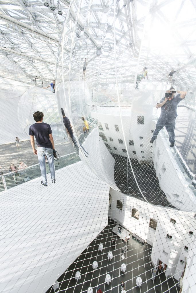 Die 2.500 Quadratmeter große Netzstruktur beherbergt fünf luftgefüllte ‚Sphären‘, und die gesamte Installation erzeugt eine surreale Landschaft, ähnlich einem Wolkenmeer oder dem Weltraum mit schwebenden Planeten.